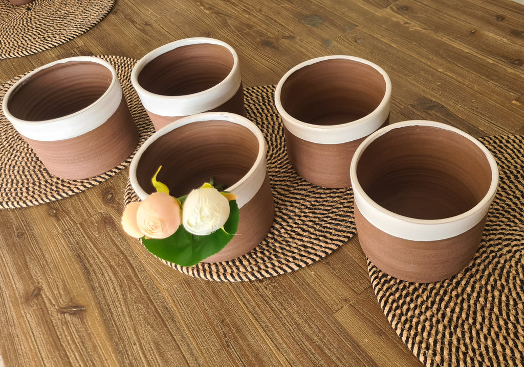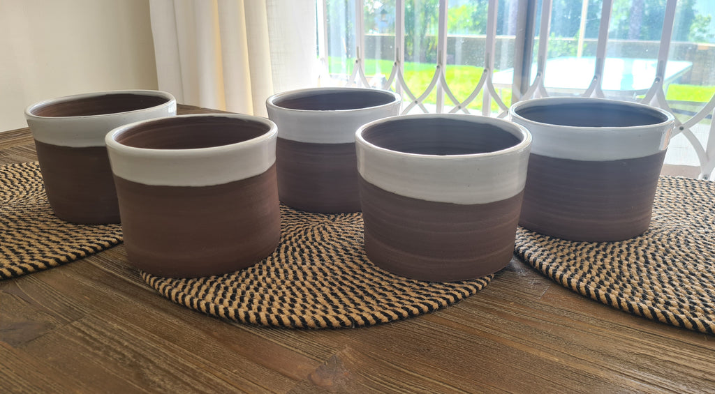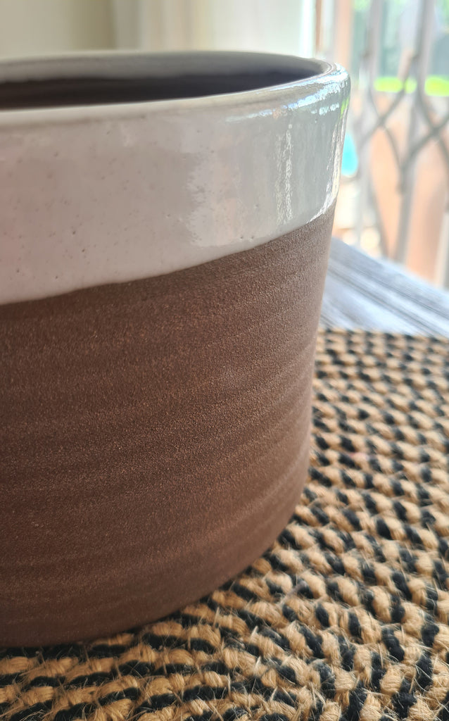 The look and feel of the brown clay vases are raw and organic. The texture feels slightly coarse dipped in part in off white glaze. Each piece is hand thrown on a pottery wheel. Perfect to place on a window sill.