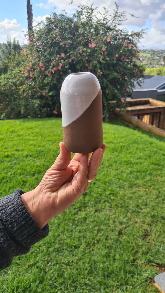 The look and feel of the brown clay vases are raw and organic. The texture feels slightly coarse dipped in part in off white glaze. Each piece is hand thrown on a pottery wheel. Perfect to place on a window sill.